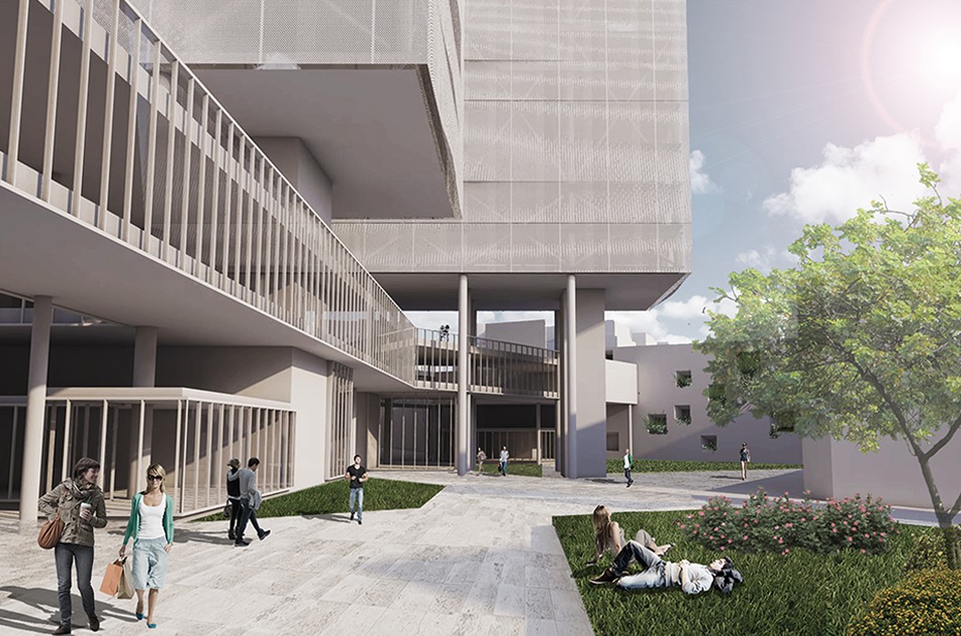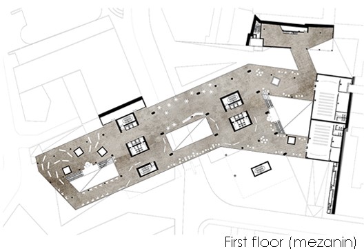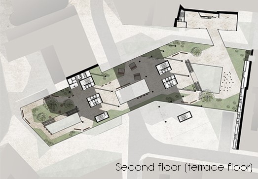 Terenurile publice și spațiile verzi acoperă parterul și mezaninul, în timp ce terasa este transformată într-un parc mare, accesibil publicului comun.