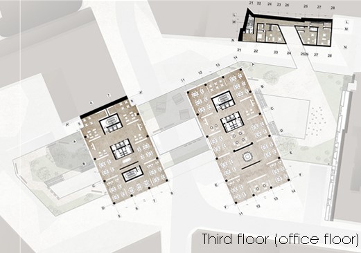 Pe de altă parte, birourile au fost ridicate la o înălțime care nu le permite să fie ușor observate (18 m fiind nivelul de la care acestea pleacă); mai mult, tot ceea ce se află sub acestea este văzut ca spațiu pentru comunitate.